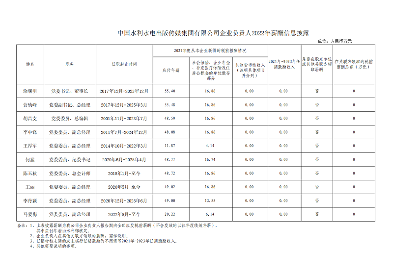 水電知識網»資訊»通知公告»中國水利水電出版傳媒集團有限公司企業負責人2022年薪酬信息披露